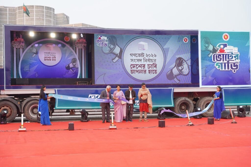 Information and Broadcasting Advisor Syeda Rizwana Hasan, Cultural Advisor Mustafa Sarwar Farooqui, Senior Secretary of the Election Commission Secretariat Akhtar Ahmed, and Press Secretary to the Chief Advisor Shafiqul Alam inaugurated the voting vehicle by cutting the ribbon from the venue.